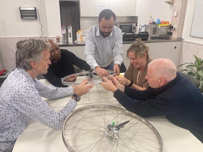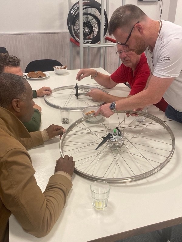 In 20 minuten probeerden we met de hand een wiel van spaken te voorzien — een flinke uitdaging, techniekdocent of niet!